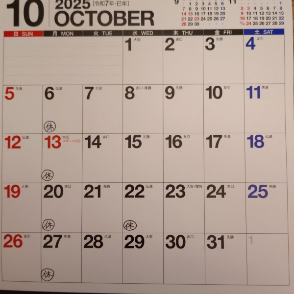 10月のお休みは