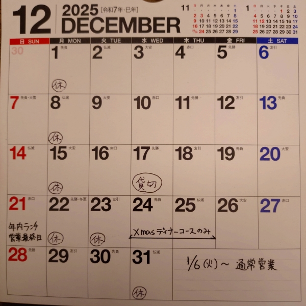 12月のお休みは